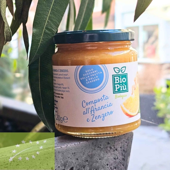 Skład: 40% pomarańcze BIO, 1% imbir BIO, zagęszczony sok jabłkowy, przecier jabłkowy, pektyna owocowa