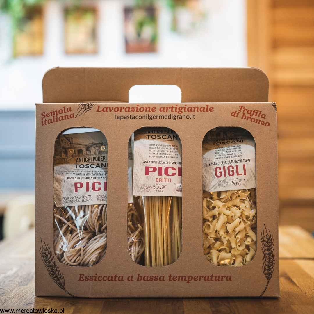 Typowy toskański kształt makaronu, ręcznie formowany, ciągniony metodą brązową, z włoskiej semoliny z pszenicy durum, suszonej w niskiej temperaturze.
