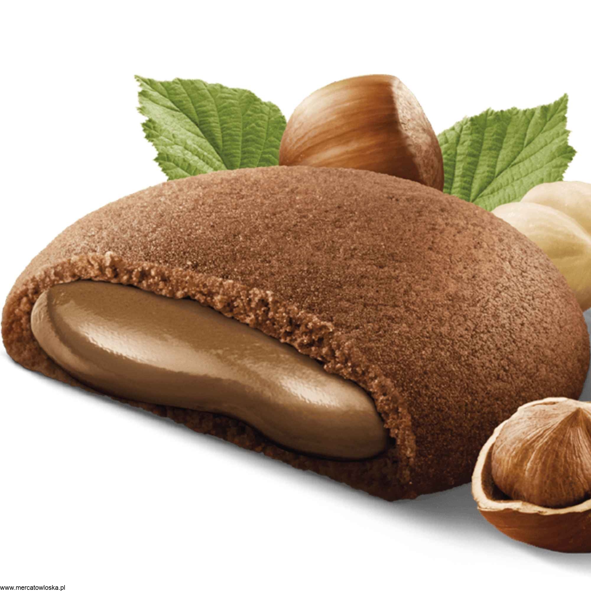 Skład: Mąka PSZENNA , cukier, oleje roślinne (palmowy, sojowy, słonecznikowy), pasta z ORZECHÓW LASKOWYCH 16% w śmietance, pełne MLEKO w proszku , syrop glukozowy, JAJA z chowu w puszcze , kakao, skrobia PSZENNA , skrobia kukurydziana, MASŁO , emulgator: lecytyna SOJOWA , sól, substancje spulchniające: wodorowęglan sodu, wodorowęglan amonu, aromaty.