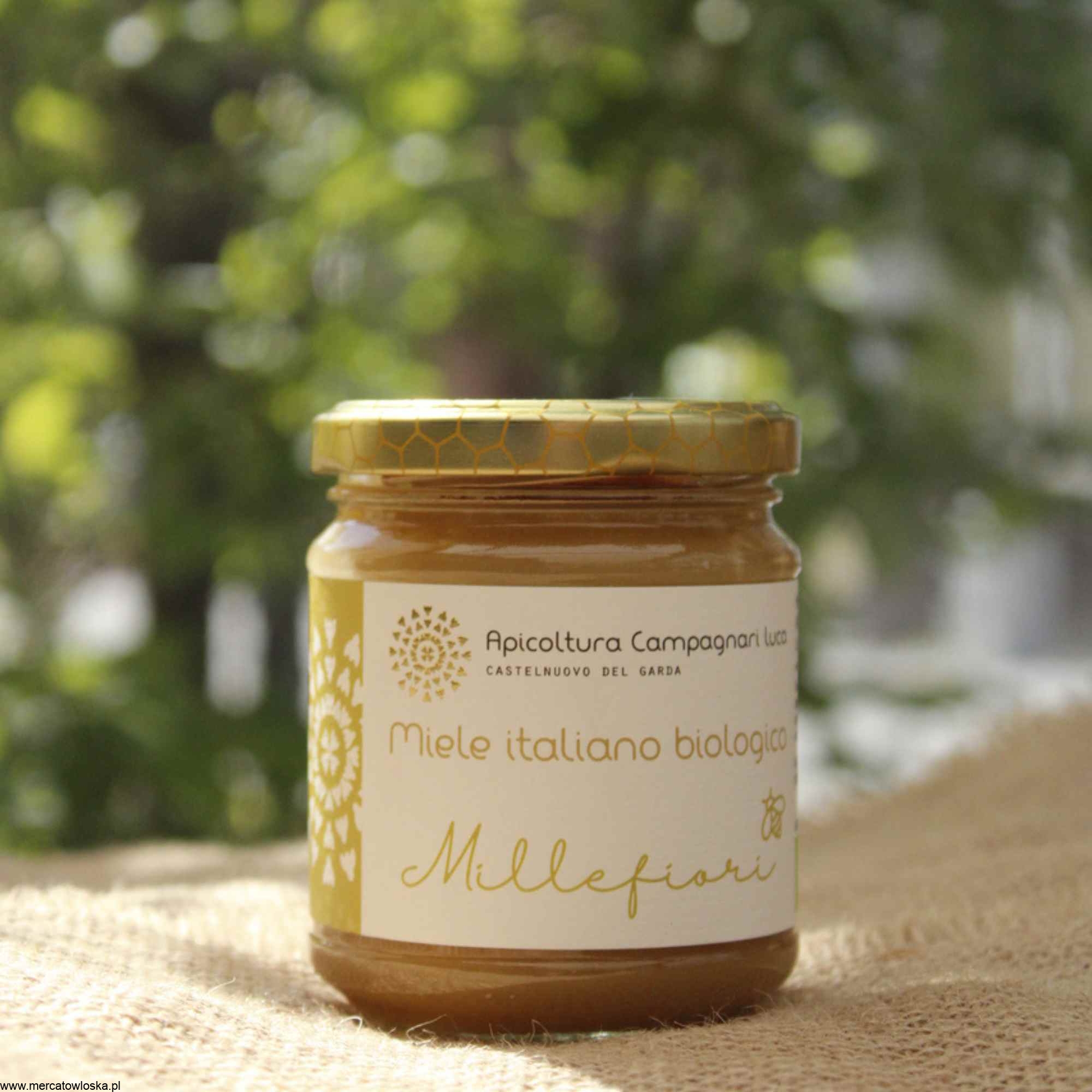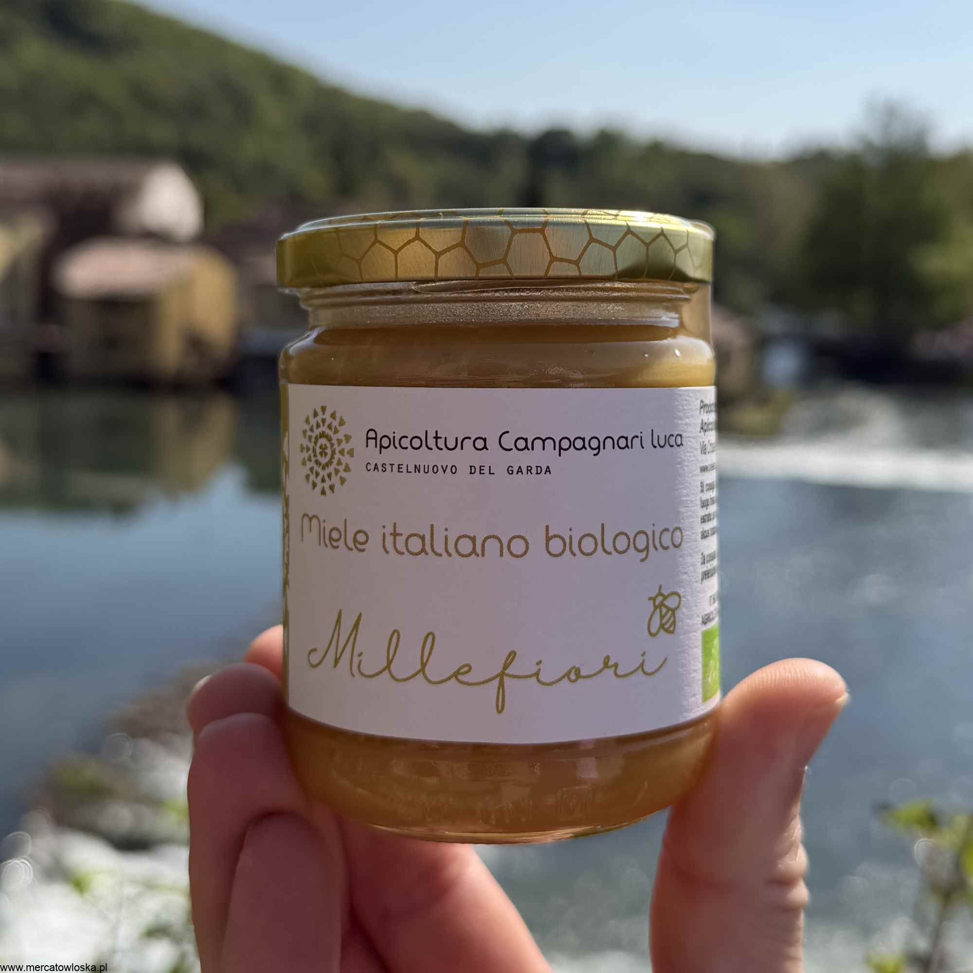 Miód Millefiori od Miele Campagnari to esencja bioróżnorodności okolic jeziora Garda. Ten nagradzany miód wielokwiatowy powstaje z nektaru dzikich kwiatów, ziół i krzewów porastających morenowe wzgórza. Dzięki biologicznym metodom produkcji i braku filtracji, miód zachowuje pełne spektrum pyłków roślinnych, co przekłada się na jego bogaty, kwiatowy aromat i zmienną, złocistą barwę.