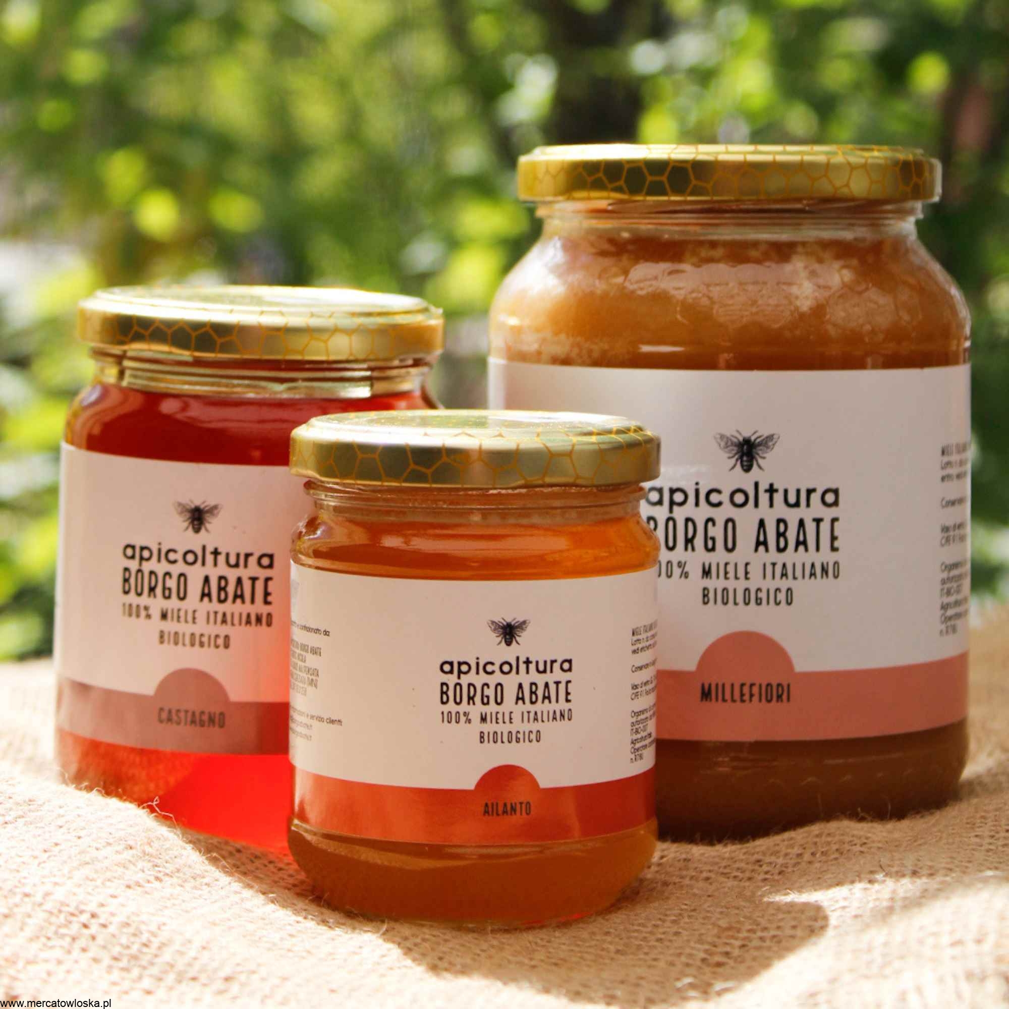 Miód z kasztana (Castagno) od Borgo Abate to jeden z najbardziej charakterystycznych miodów Italii. Pozyskiwany w okresie od czerwca do lipca, charakteryzuje się ciemnobursztynową, niemal czarną barwą oraz płynną konsystencją, która dzięki wysokiej zawartości fruktozy rzadko ulega krystalizacji. Posiada intensywny, ostry zapach i wyrazisty smak z wyraźną, szlachetną goryczką na finiszu.